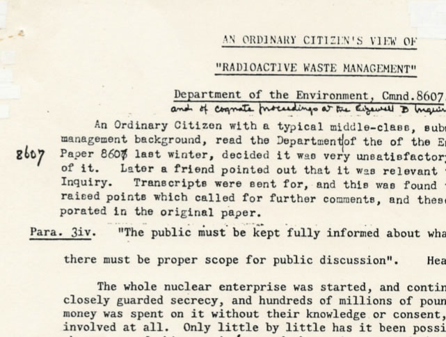 . On 21 March 1984, she was preparing to present her paper  An Ordinary Citizen’s View of Radioactive Waste Management (pdf) as one of very few independent objectors at the first public inquiry into a new nuclear power plant in Britain, at Sizewell. At about midday, following a break-in at her home where it seems only a little cash was found to be missing, she was apparently abducted in her own car, which a man was seen driving erratically by many witnesses. A farmer quickly reported it abandoned on the side of a lane through his land just outside Shrewsbury; but the West Mercia Police took nearly three days to find her mutilated body in a poplar copse nearly half a mile across fields from the car.